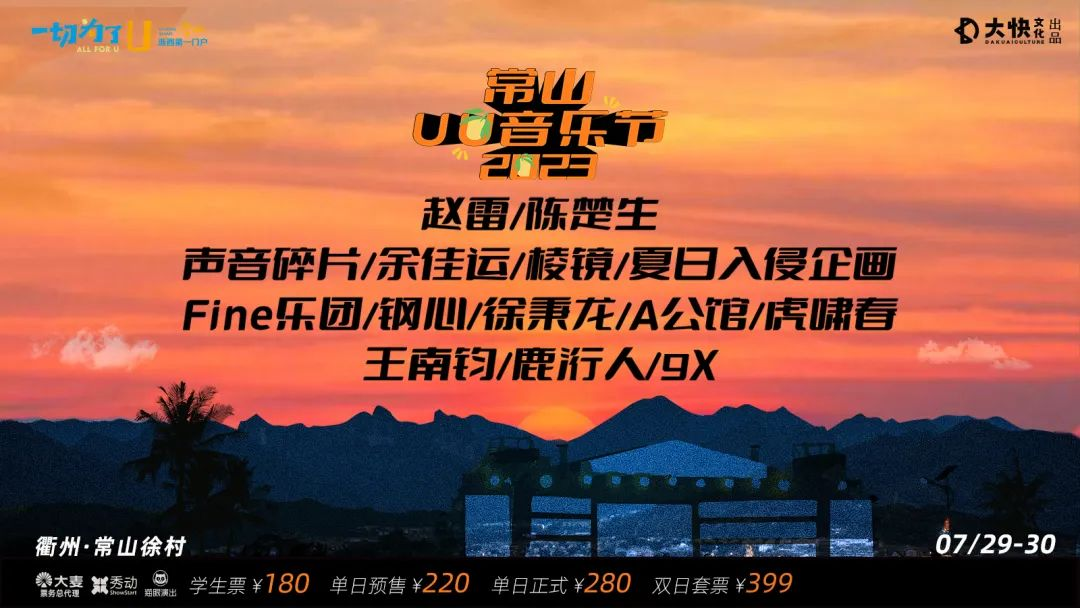 2023常山UU音乐节,今日14:00开票!大麦APP、秀动APP、猫眼APP、开放购票。演出时间表、现场玩法、接驳路线、交通攻略等更多信息将持续推出,请保持关注!
